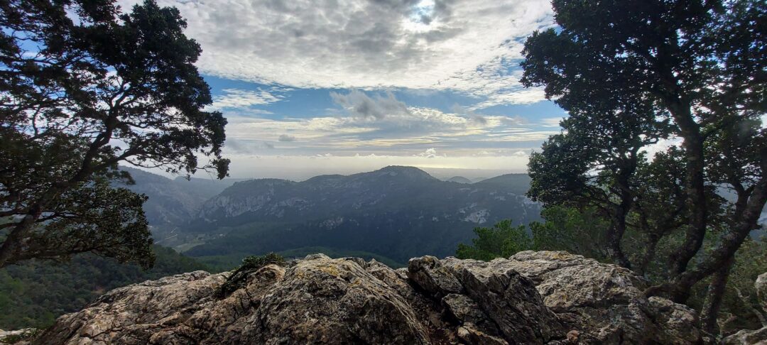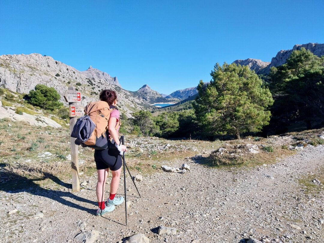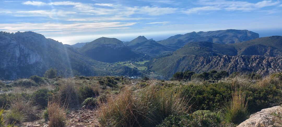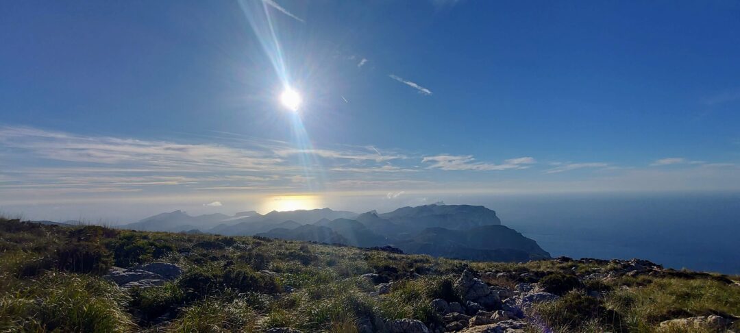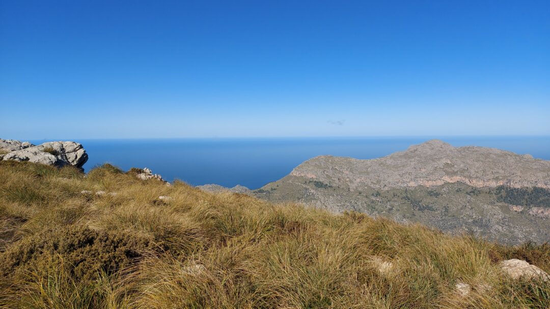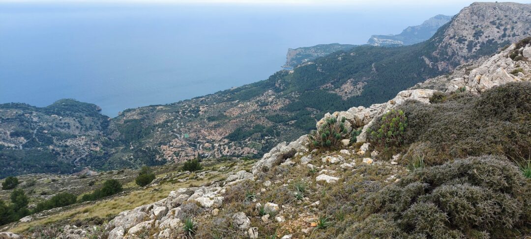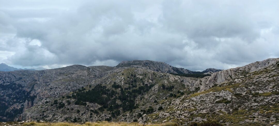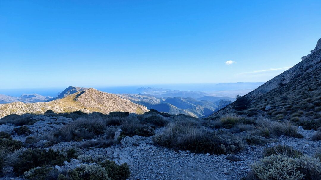 Začal šiesty deň. Trošku nám dochádza, že zajtra je koniec 🙁. Aby nám nebolo ľúto, celý čas fúka odporný, studený a nárazový vetrisko. Taký, aký poznáme doma na horách 😀 . Keď vyšľapeme do sedla Coll des Prat (1205 m), spomeniem si, že som si chcela spraviť zachádzku na najvyšší dostupný vrch Mallorcy – Masanella (1364 m). Ach, neskoro. A možno aj dobre, veď by ma zaisto sfúklo niekam do mora. Vyťahujem nákrčník, páperovú bundu a aj tak mrznem. Prechádzame cez najvyššie položenú čast GR221, dostávame sa do sedla Coll de ses Cases de Neu, odkiaľ už naozaj vidíme náš cieľ. Druhý koniec Mallorcy. Prichádza záplava endorfínov z pocitu zdolaného treku.