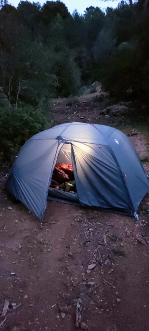 Samotné refugi (chata) Coma d’en Vidal nie je v prevádzke a nieje tu ani voda. Ale aj keď chata nie je otvorená, na terase, pod strieškou, je dosť miesta na spanie. Na Mallorce stanovanie dovolené nie je, pretože skoro celý ostrov sú súkromné pozemky (väčšinou oplotené). Keď však dodržíš zásadu, že po sebe vôbec nič nezanecháš, zakempíš večer a pobalíš sa so svitaním, nemal by byť problém. Prvá noc je extrémne veterná, do stanu nám nafúka asi kilo prachu a piesku 😀 .
