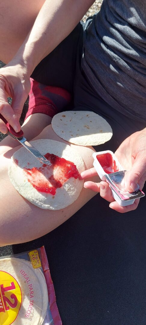 Trasa GR221 sa pred mestečkom Banyalbufar rozdvojuje, ale vzhľadom na to, že máme dosť vody aj jedla na aktuálny deň, nepotrebujeme zachádzku. Prepáč Banyalbufar. Obedy riešime suchými klobáskami (ešte z Palmy) a tortillami s jahodovým džemom.